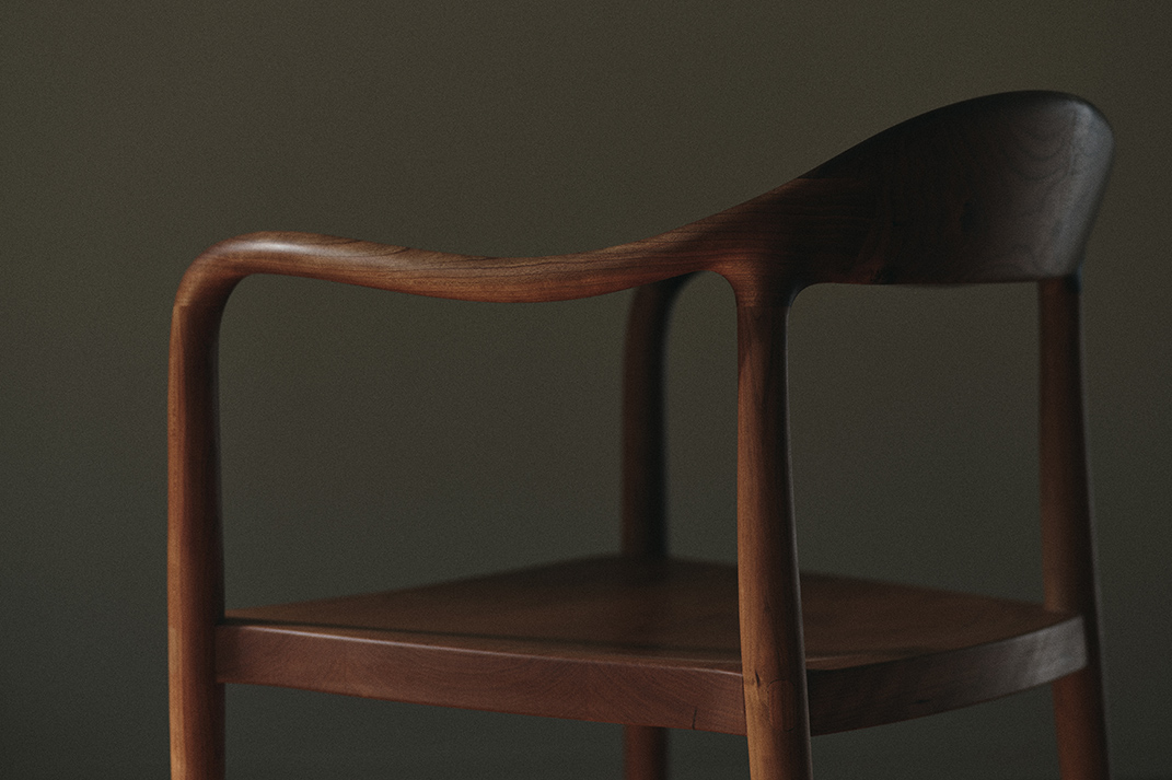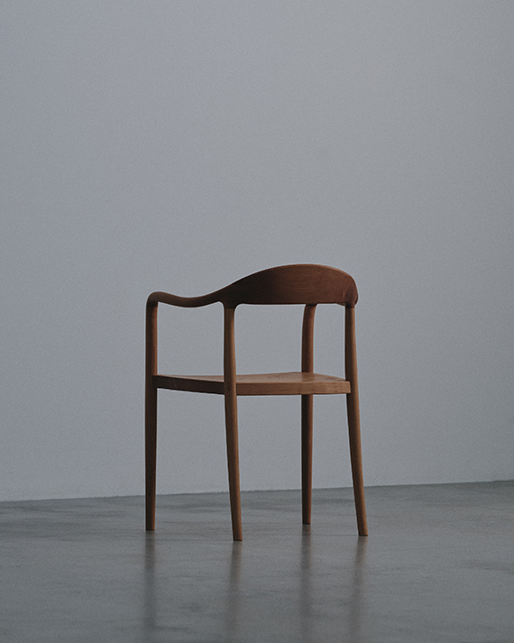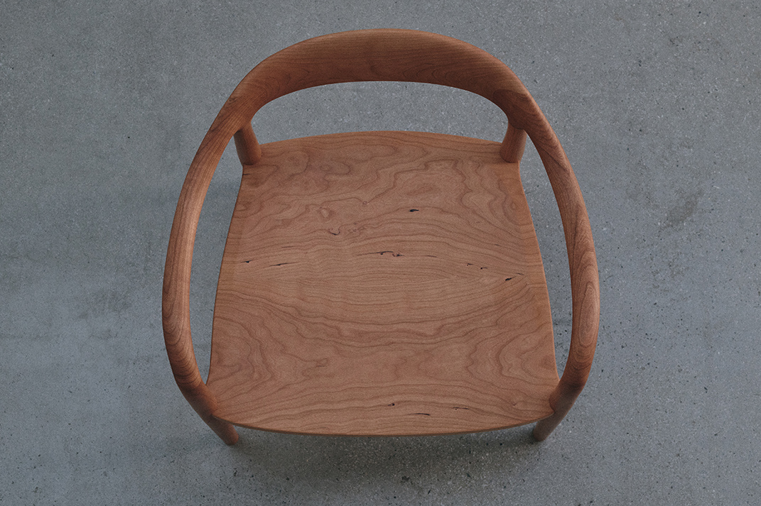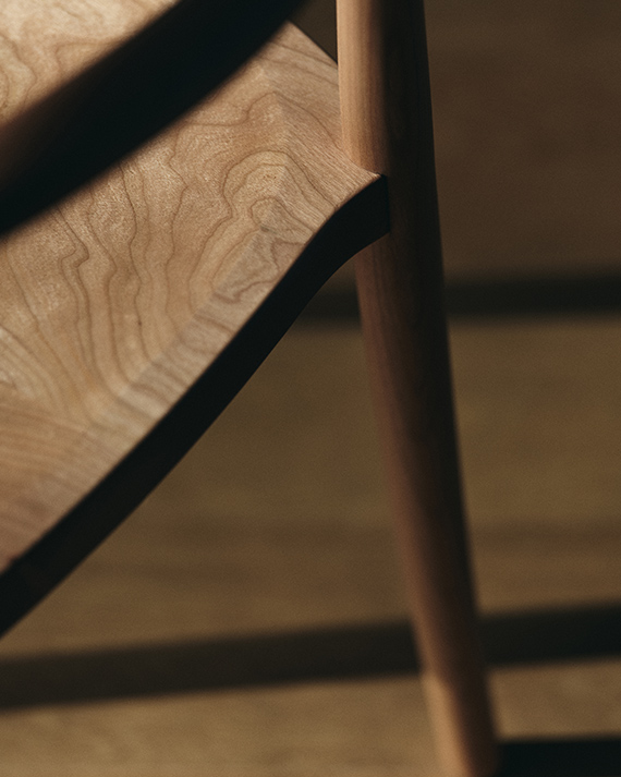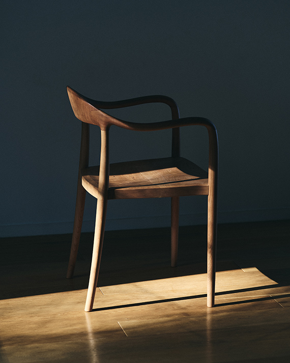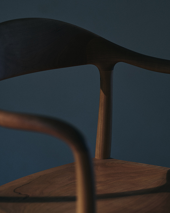“背から肘掛けへと流れる美しいラインは、非常に複雑な三次曲面となるため、無垢材の特性を鑑みながらミリ単位で繰り返し調整しました。”(職人・岩下光為)