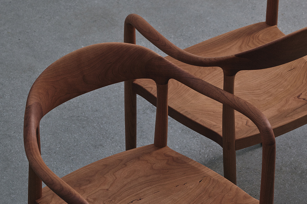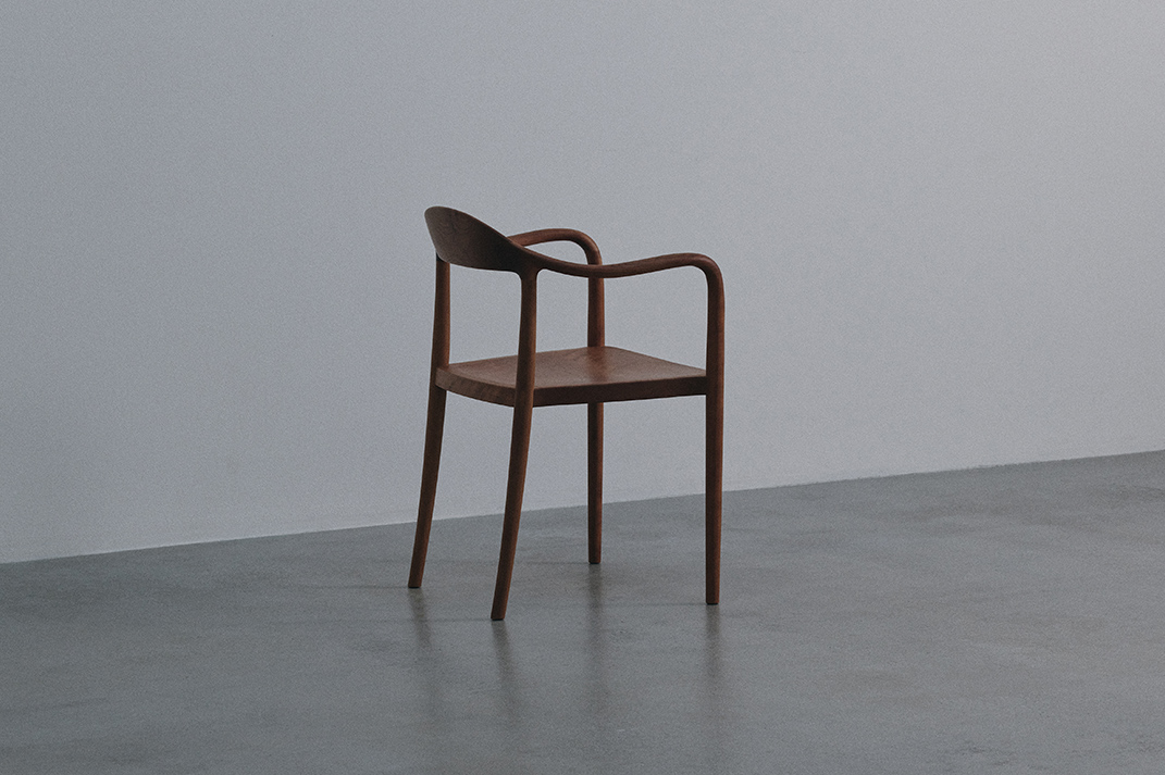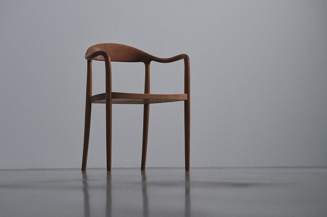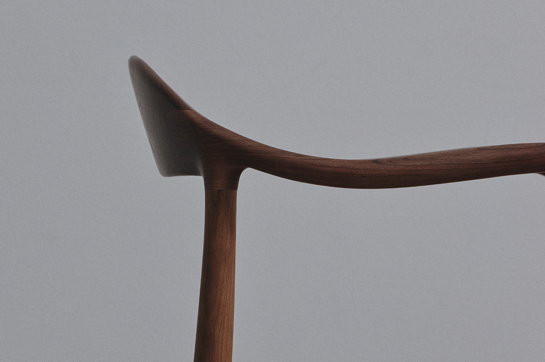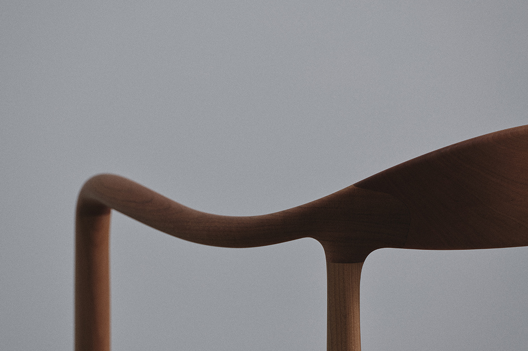 “背から肘掛けへと流れる美しいラインは、非常に複雑な三次曲面となるため、無垢材の特性を鑑みながらミリ単位で繰り返し調整しました。”(職人・岩下光為)