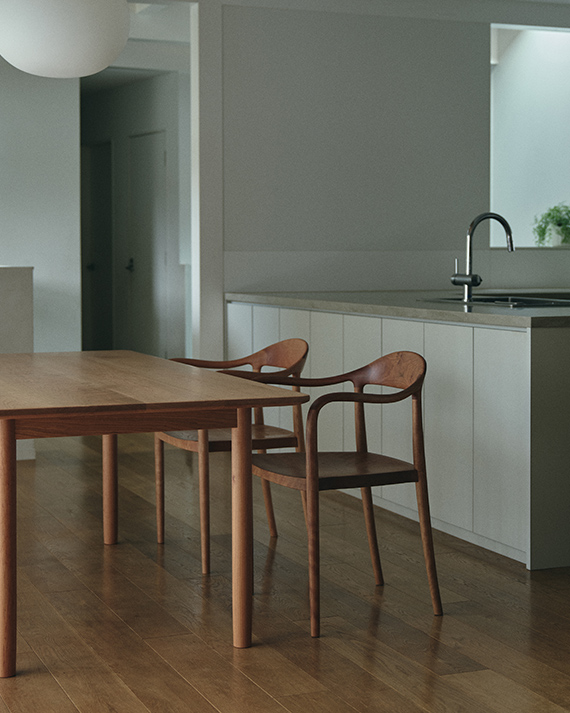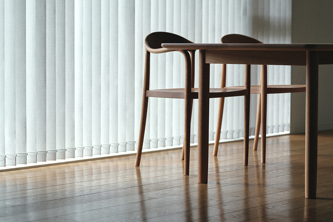 暮らしの風景にすっと馴染む、静かで穏やかな佇まいを湛える「MIO」。豊かな地下水が流れる昭島の風景を思い描き、水脈を意味する言葉「澪」から命名。思わず手を滑らせたくなる柔らかな木肌、自然の造形にも通じる美しいフォルムとも連動しています。