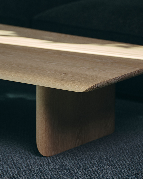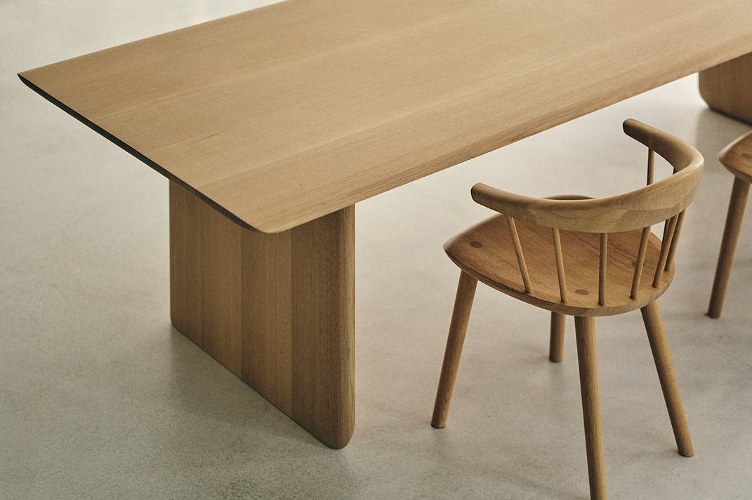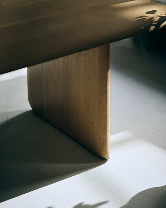 USU CHAIRに合わせるテーブルとして考えられたUSU TABLE。厚みのある天板と板脚の端部は、熟練の職人が手仕事で曲線に削り込み、全体のフォルムをシームレスな印象に整えました。