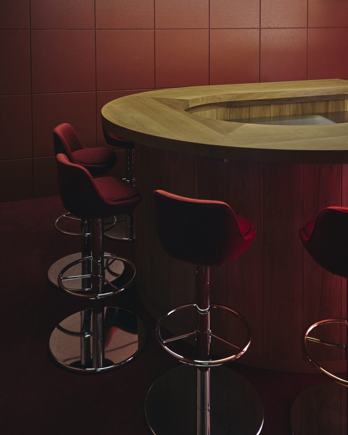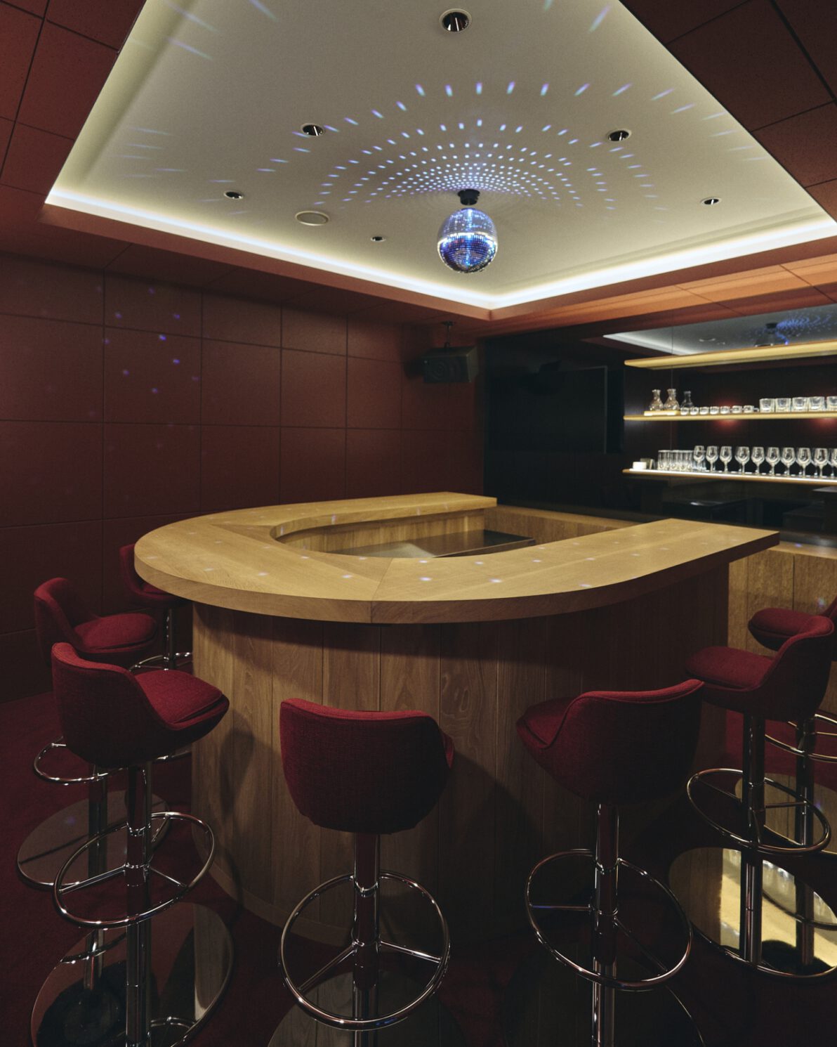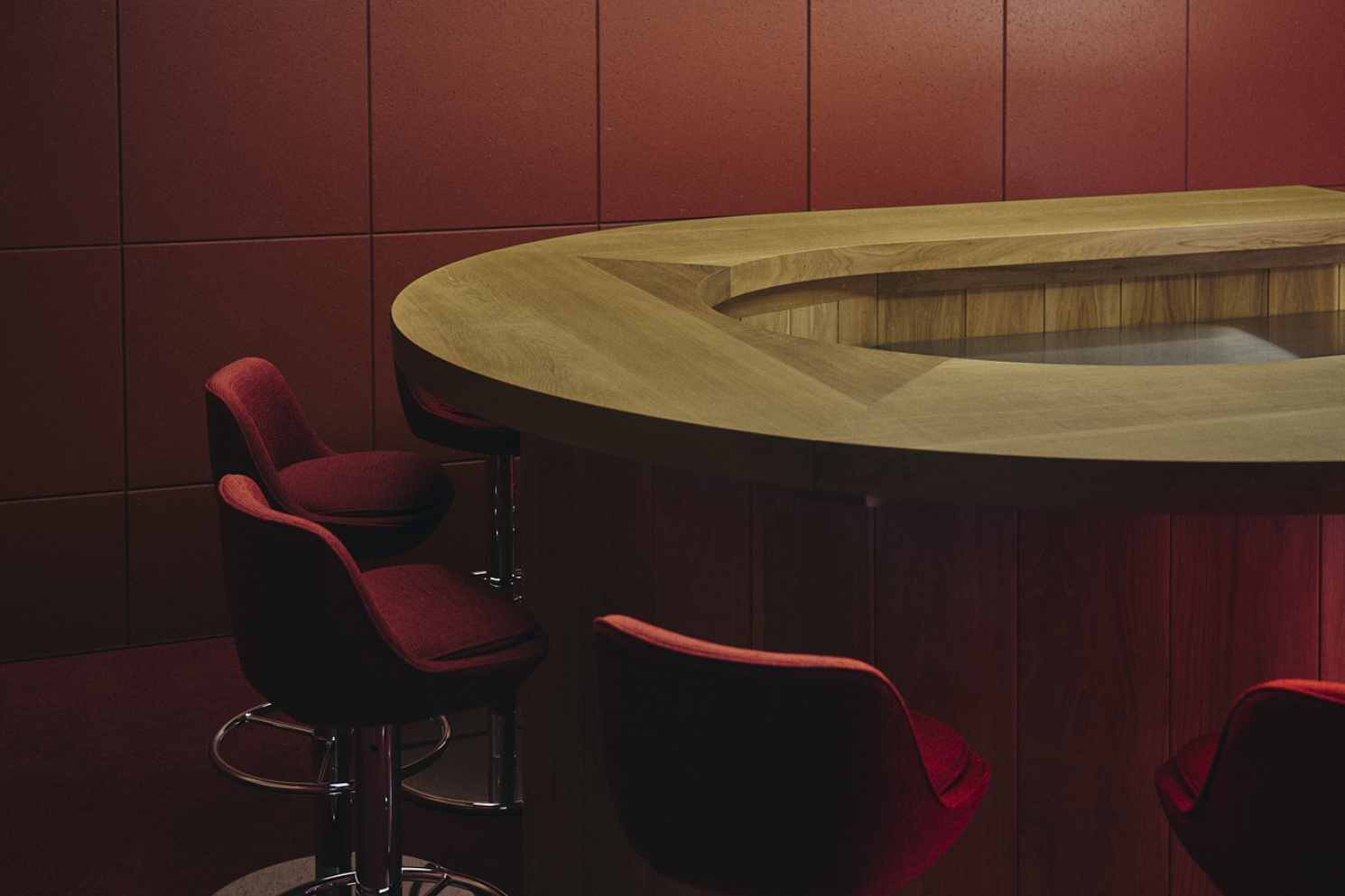 三菱電機の共創空間、Serendie Street Yokohamaにはコミュニティメンバーが集うためのバーが設けられています。U字型のカウンターには国産のナラを使用。ずっと触れていたくなるような重厚感があります。また、訪れる人同士やもてなす人との距離を縮める設計により、Serendie Street Yokohamaのコンセプトである偶発的な出会いを促します。カウンター奥に設置した棚の扉表面加工には、床の表面などで使われることの多いなぐりの技術を活用。光の当たり具合に応じて変化する様々な表情が、華やかさを演出します。