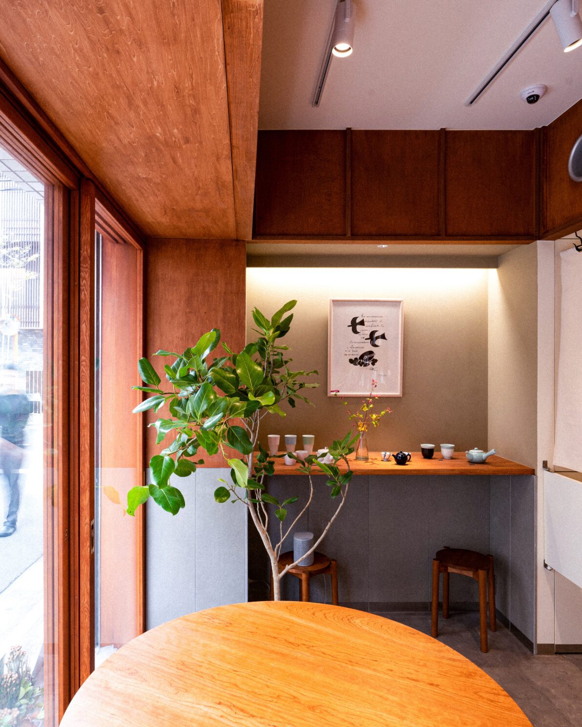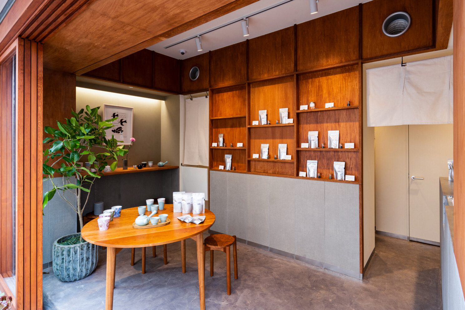 東京・吉祥寺の日本茶専門店、茶場白は、テーブル煎茶にインスピレーションを受けたユニークなショップ。人と人の出会いをコンセプトにした店舗の開店に合わせて、ラウンドテーブルとスツールを制作しました。内装の棚や壁に合わせて樹種はチェリーを選び、天板の断面も作り付けの商品棚に合わせてシャープな印象に。座った時に適度な緊張感を生み出すために少し高めに設計したテーブルはディスプレイ台としても使うことができ、表通りからも目に入るアイコンとしても機能しています。