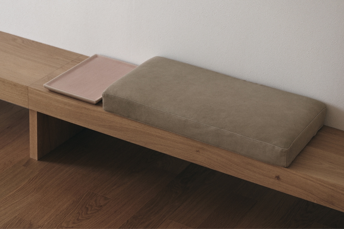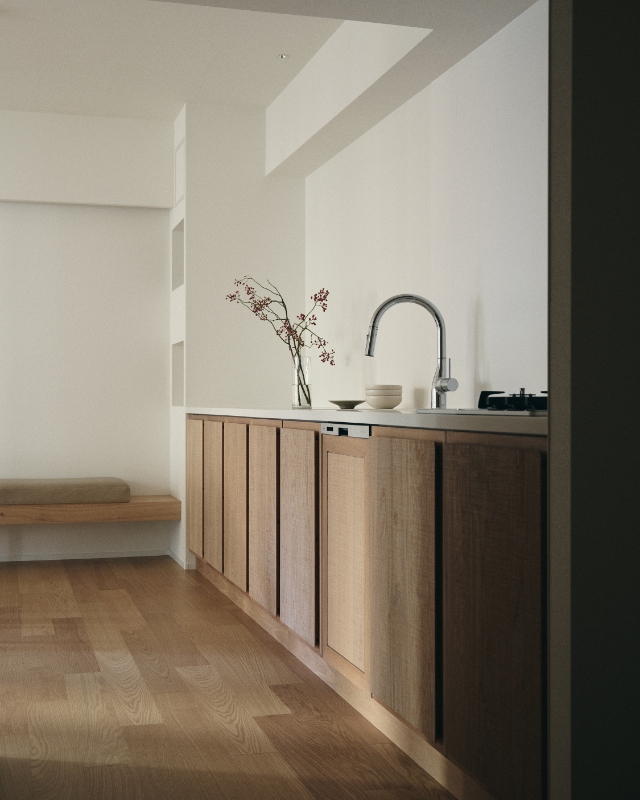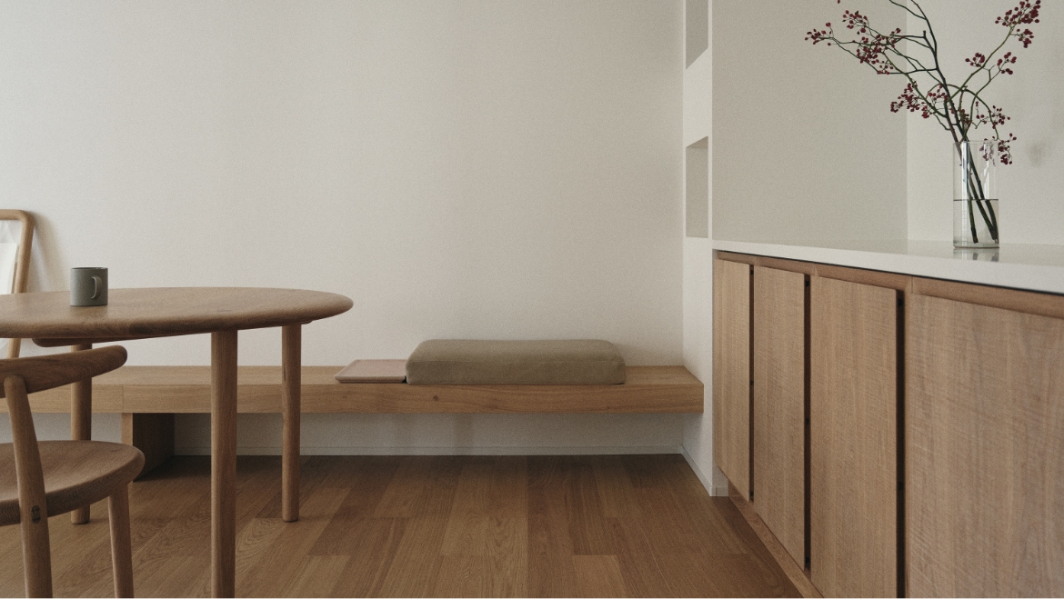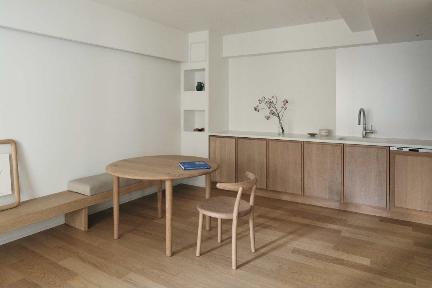 都心の一角に佇むマンションのリノベーションプロジェクト。リビングの象徴となる約3.8mのキッチンは、鉋によって立体的な削り跡を施した無垢の面材で造作し、家具のように空間へと溶け込みます。壁付けのベンチ兼テレビボードには、青森の馬革ブランド〈GOBU〉の革を使ったクッションと、京都・清水焼〈TOKINOHA〉のサービングボードを特注し、異素材の手仕事を掛け合わせました。寝室にはデスクと棚を造作。職人の精緻なクラフトマンシップと素材の豊かな手触りが、日常の時間にさりげない特別感を添えています。