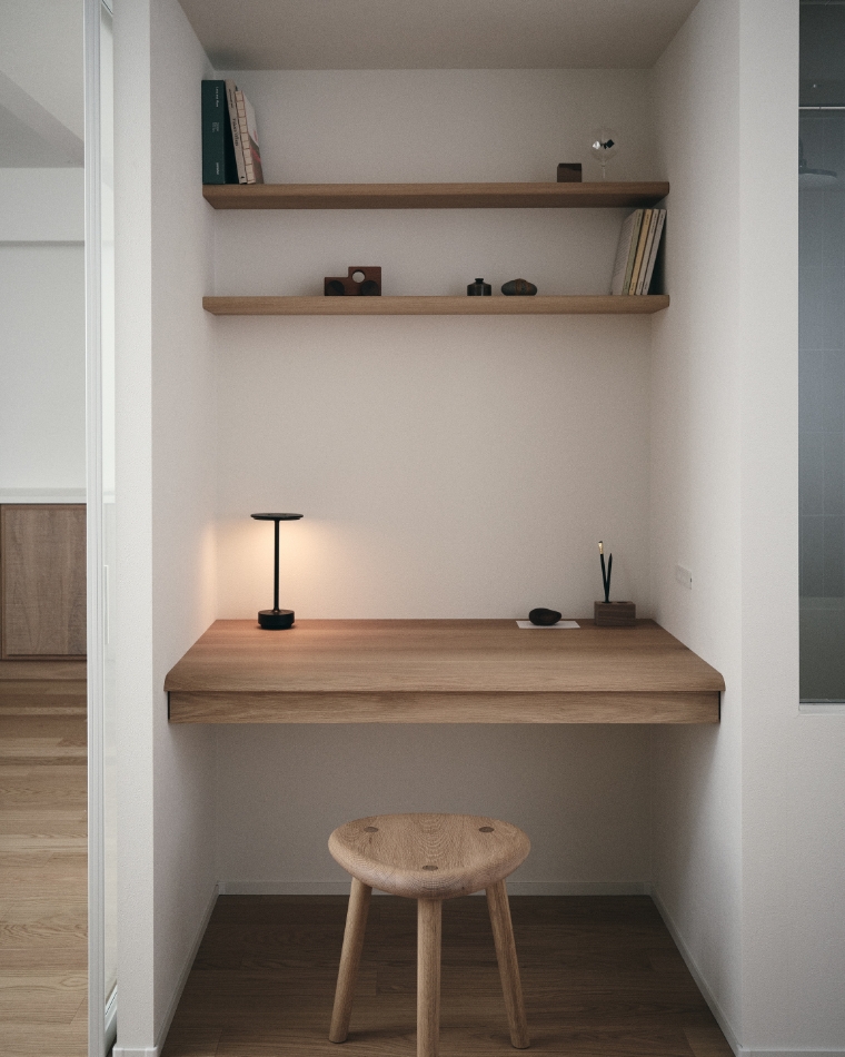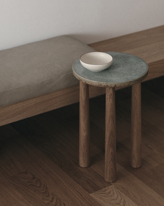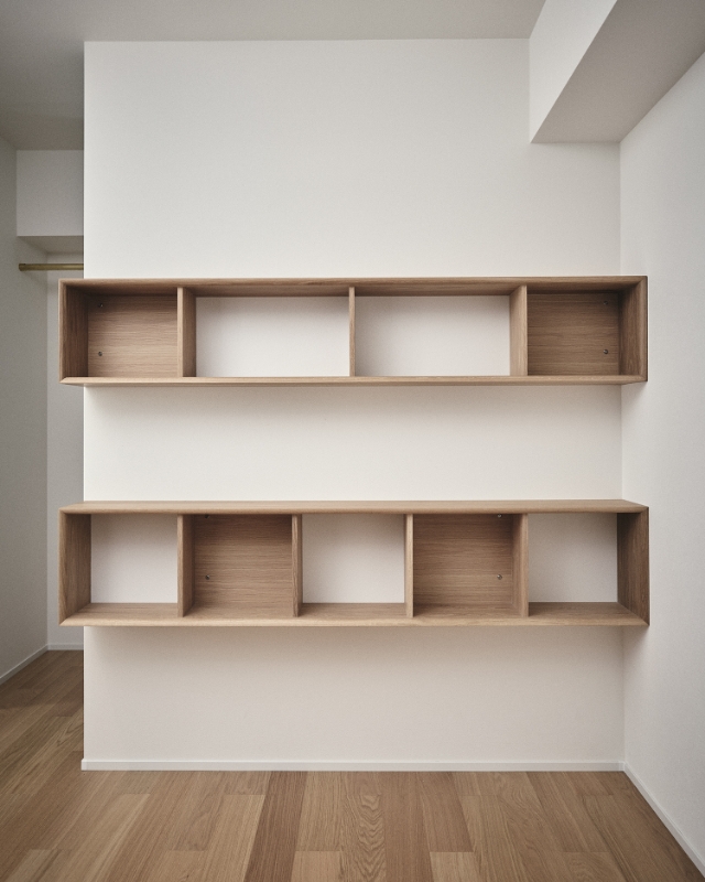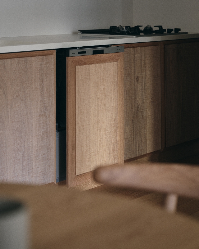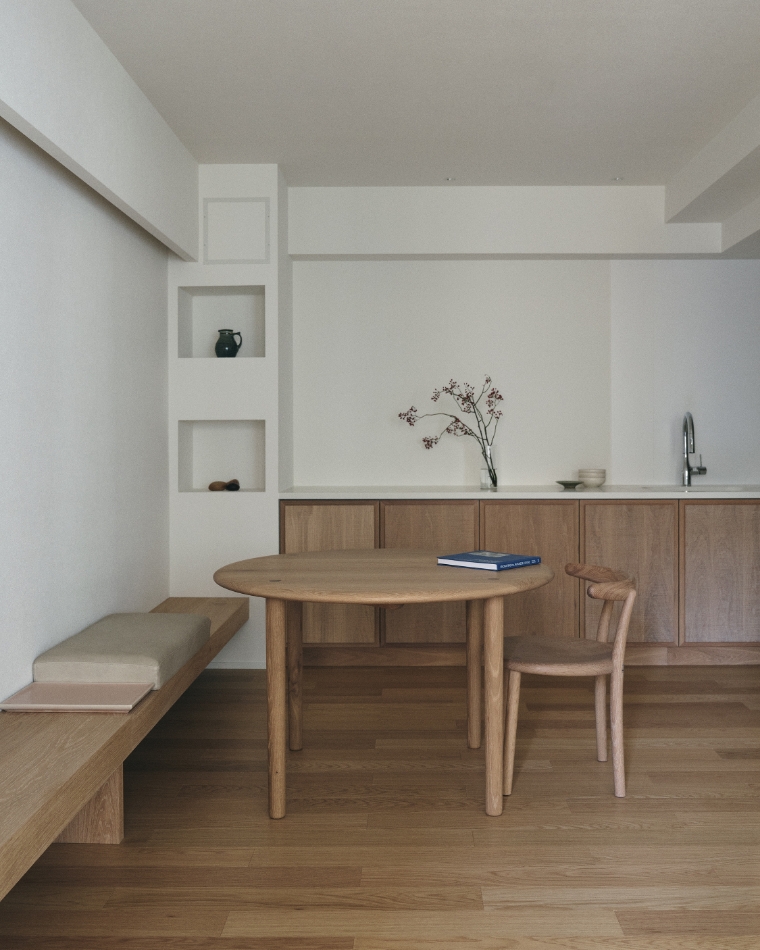 都心の一角に佇むマンションのリノベーションプロジェクト。リビングの象徴となる約3.8mのキッチンは、鉋によって立体的な削り跡を施した無垢の面材で造作し、家具のように空間へと溶け込みます。壁付けのベンチ兼テレビボードには、青森の馬革ブランド〈GOBU〉の革を使ったクッションと、京都・清水焼〈TOKINOHA〉のサービングボードを特注し、異素材の手仕事を掛け合わせました。寝室にはデスクと棚を造作。職人の精緻なクラフトマンシップと素材の豊かな手触りが、日常の時間にさりげない特別感を添えています。